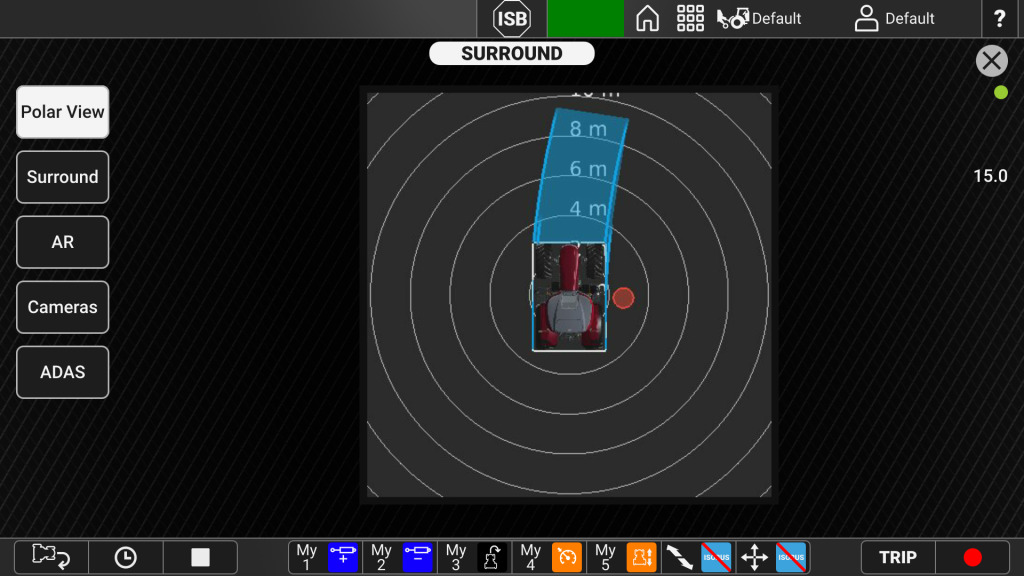 One of the most fascinating aspects of Hyper Safety View is the use of Augmented Reality (AR), which enriches the operator’s experience with real-time visual information that is perfectly integrated with the real world around them. When the operator selects the Hyper Safety View function on the cab’s DSM (Data Screen Manager) monitor, a menu appears with five main options to choose from: Polar View, Surround, AR (Augmented Reality), Cameras, and ADAS.